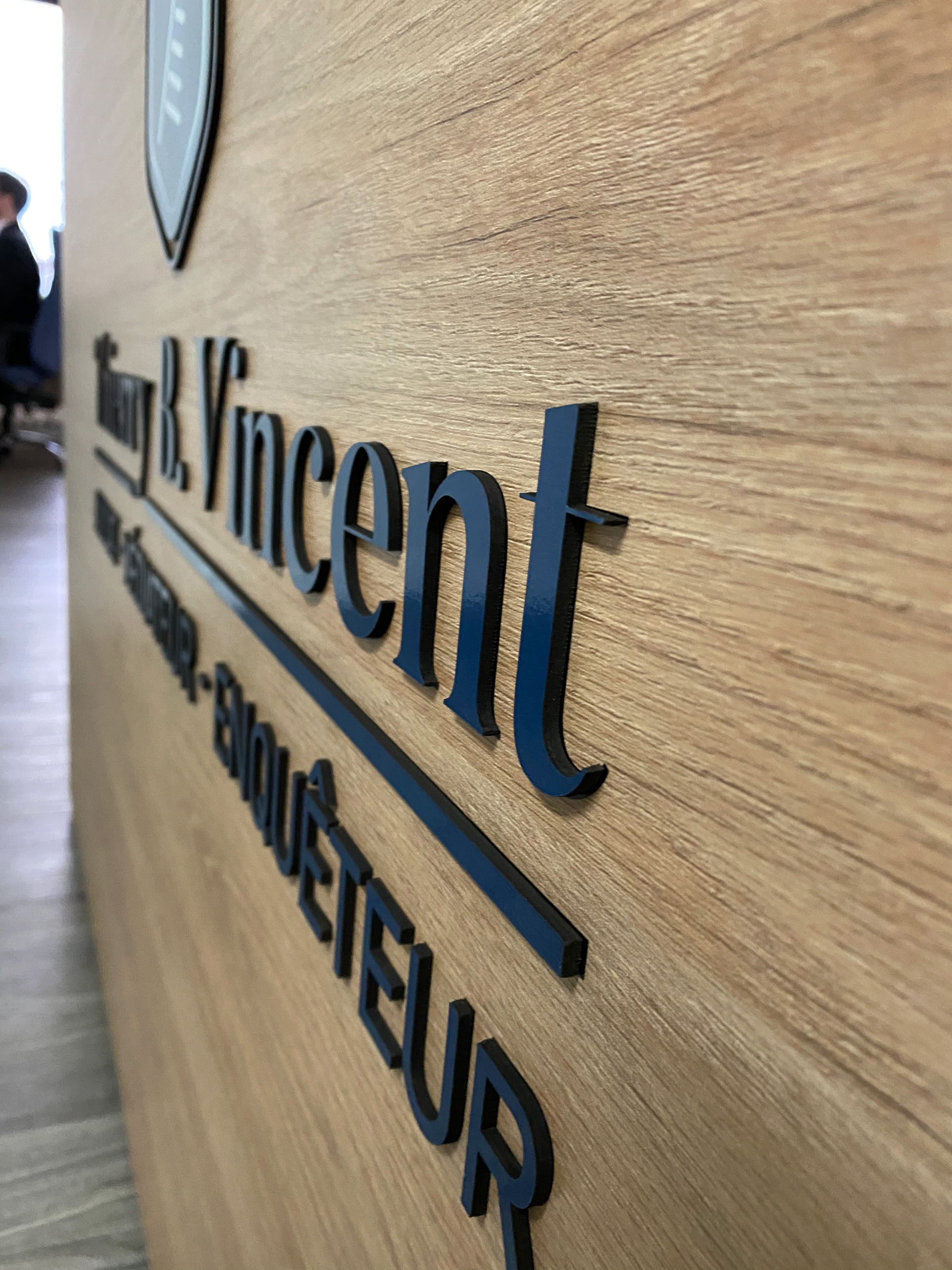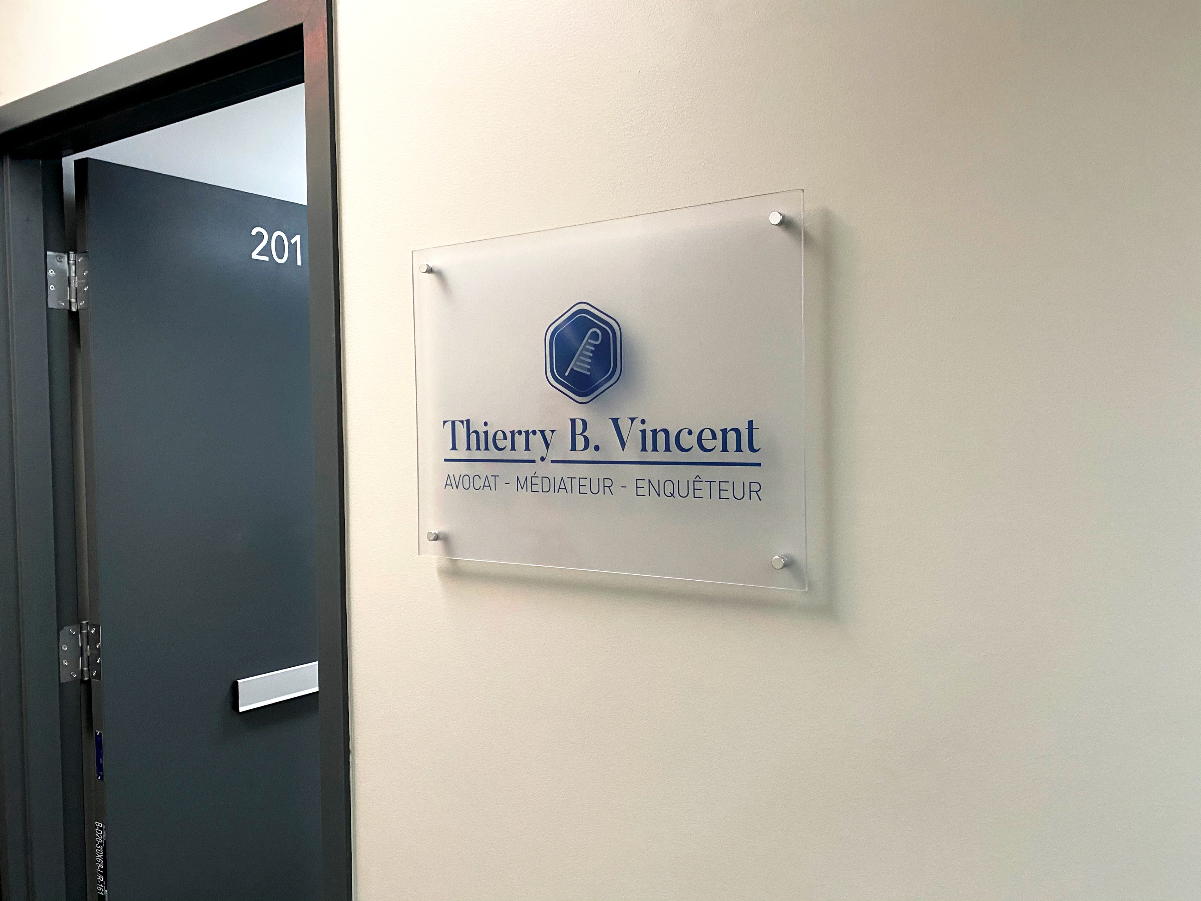 Création de logo et d'identité visuelle. Conception de signalisation intérieure, identifiant soigneusement l'entrée de son bureau. Lettres 3D en acrylique recouvertes de vinyle 3M. Plaque d'acrylique soulevée recouverte de vinyle givré.
